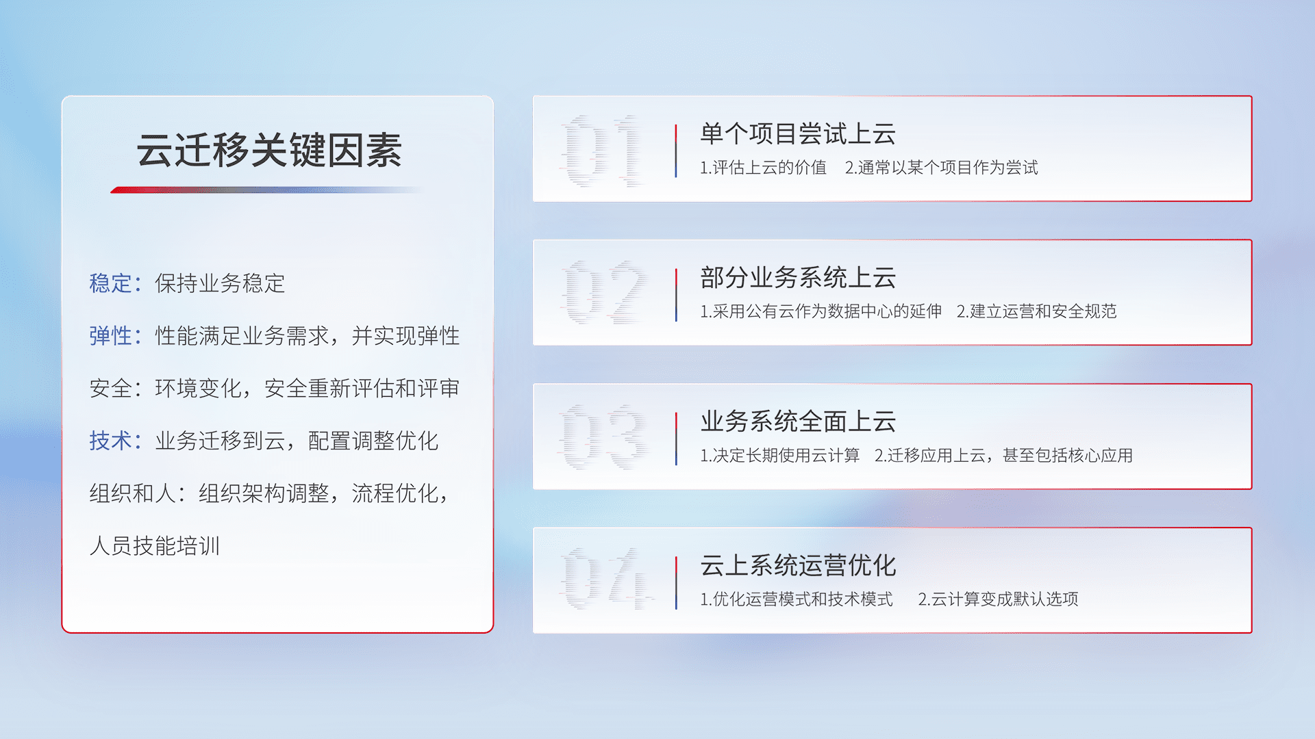 结合实际业务,,,,从规划设计、、、、云平台选型、、云原生改造、、、、数据迁移、、、、集成交付,,,,迁移全过程为客户识别最佳上云路径,,,做好风险识别管理,,,,设计网络架构、、、身份权限、、、安全审计合规、、、、操作审计、、、、日志审计、、、、监控告警策略、、、多站点容灾设计等,,,,对云上基础设施进行整体规划,,,提升IT治理水平,,以满足弹性、、高可用、、、、高性能的需求。。。。
