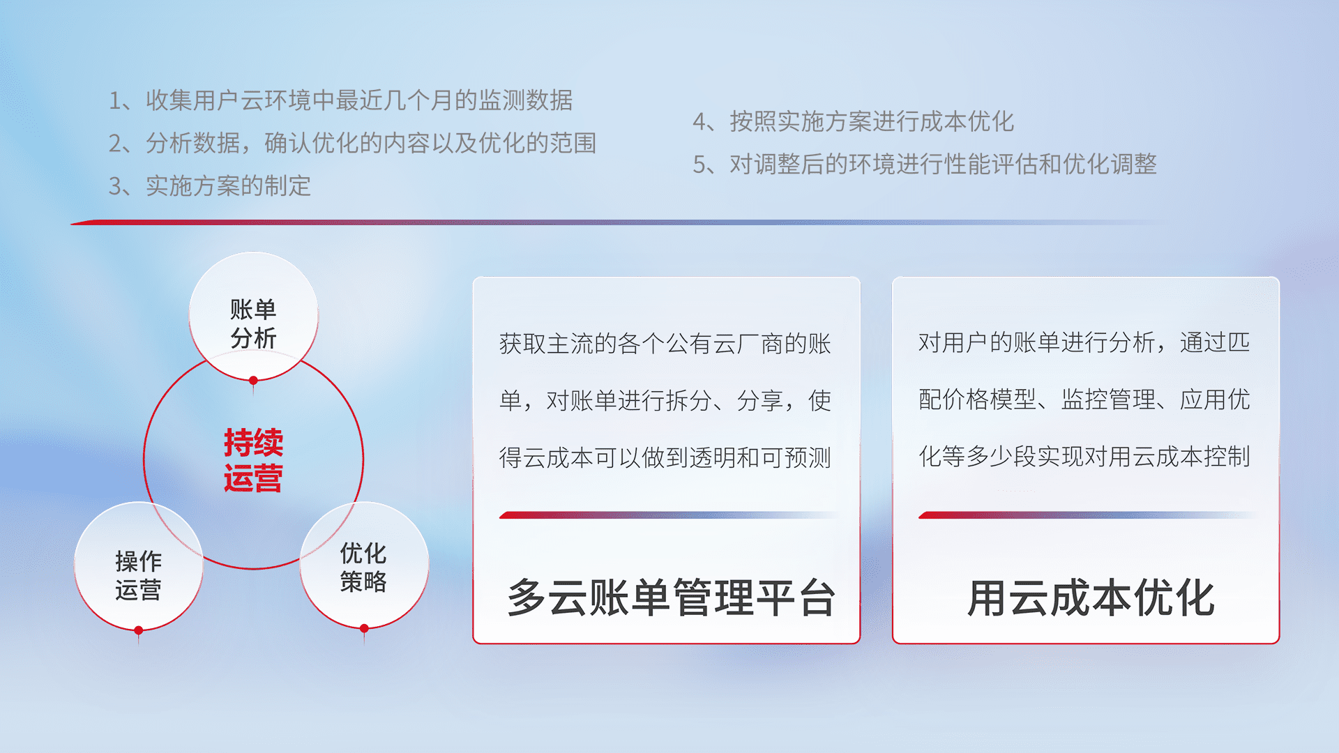 通过多云纳管,,以统一的资源数据模型把客户的云资源进行抽象和封装,,,进而实现对多云资源的统一操作,,保障云资源管理的可靠性、、、、稳定性与可用性。。。。量身定制化运维内容,,,配置、、、、开发运维、、、、补丁管理、、、、备份、、、、监控、、认证和访问管理、、审计和日常巡检等,,,,保障在用云过程中的可靠度,,,,稳定度以及高可用率。。。。